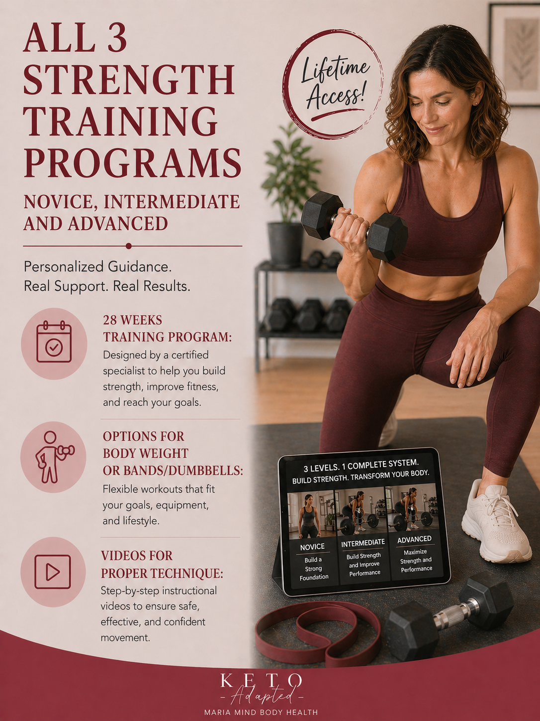 Buy now and get instant Lifetime access to all three of our amazing training programs. You get a complete 28 weeks of training progression for building strength, losing weight and toning up.  It includes: